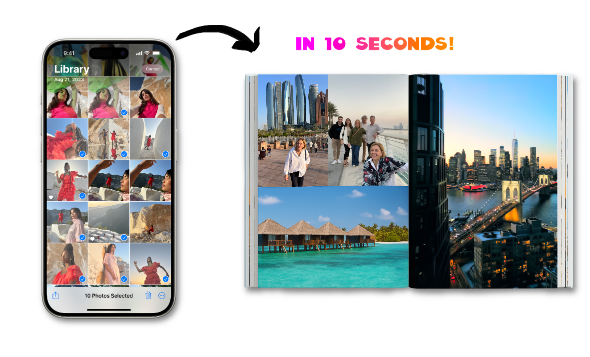 Ajoute des photos direct depuis ton téléphone ou ton ordi, notre logiciel s’occupe de remplir le livre tout seul !